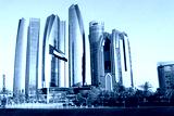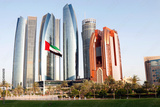 united arab emirates (uae) national flag waves on air in the sky in front of tall buildings in abu dhabi