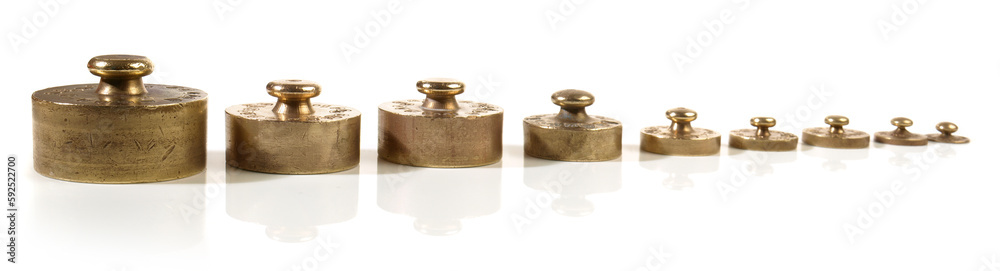 Old brass weights isolated on white background - Panorama