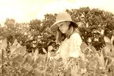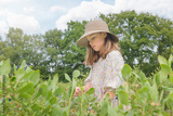 Portrait at work. Teenage girl in a wide-brimmed hat on the field. Harvesting in summer