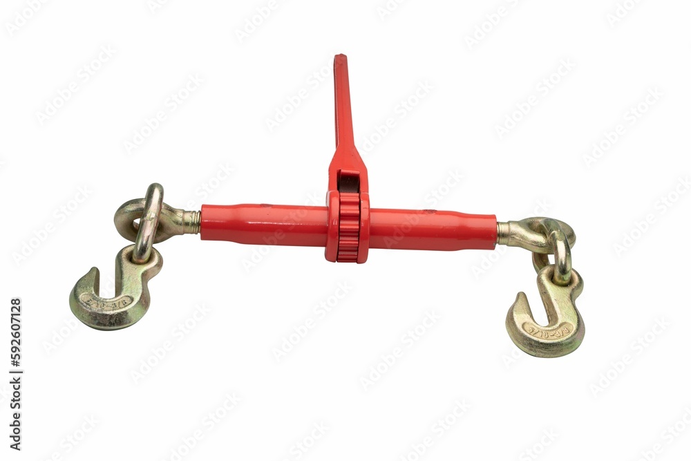 Metallic red ratchet chain binder with silver crooks for securing the load on the white background