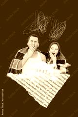 Vertical collage picture of two bored tired people yawning hold pop corn big book page piece isolated on dark blue background