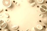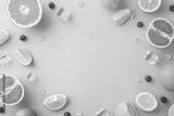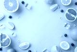 Citrus paradise concept. Top view of juicy oranges, lemons, limes and grapefruits on turquoise background with empty space for promotional text