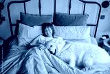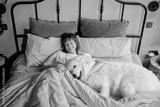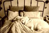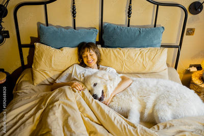 Woman sleeps with her huge and cute dog in cozy bed, view from above. Concept of home coziness and love with pets