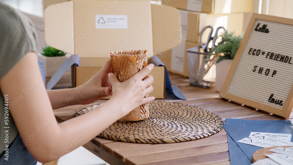 Eco vendor go green packaging parcel carton box in net zero waste store asian seller retail shop. Earth care day small SME owner asia people wrap reuse brown paper pack gift reduce plastic free order.