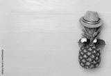 Creative pineapple hipster in sunglasses on wooden background, top view