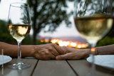 Romantic dinner date night with beautiful city sunset views. Couple holding hands feeling in love