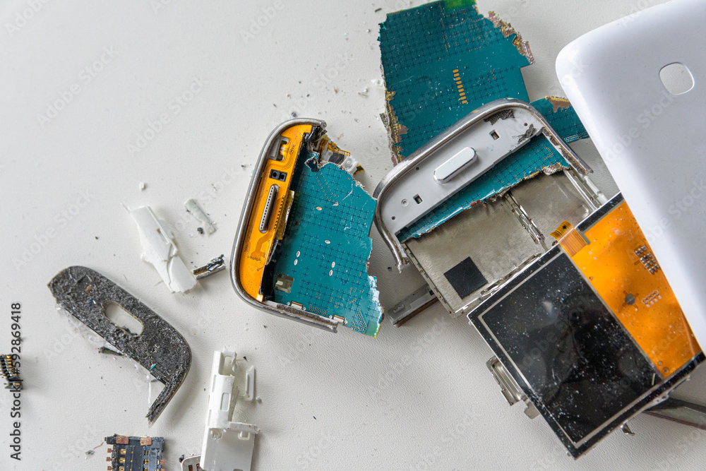 Broken white smartphone. The insides of a dropped smartphone in a white case. close-up top view
