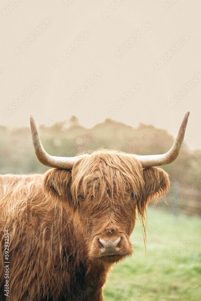 Closeup of brown Highland cattle in green pasture in valley in Upper Bavaria.