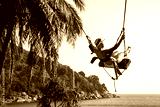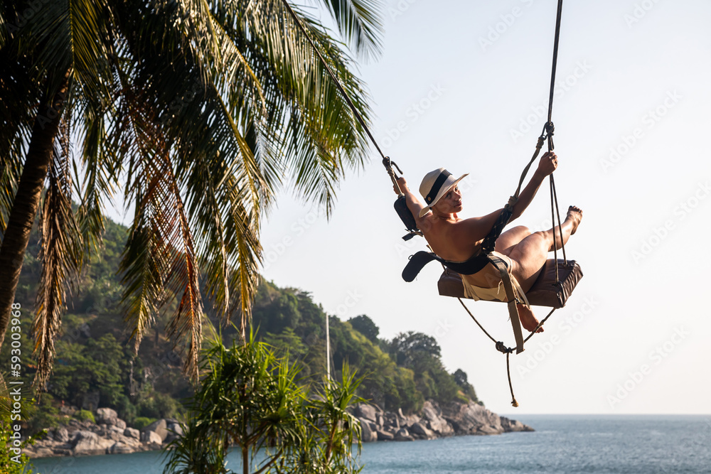 A beautiful young girl rides on a swing. Swings on the beach. Sunny summer evening. Sea and mountains. Young girl.
