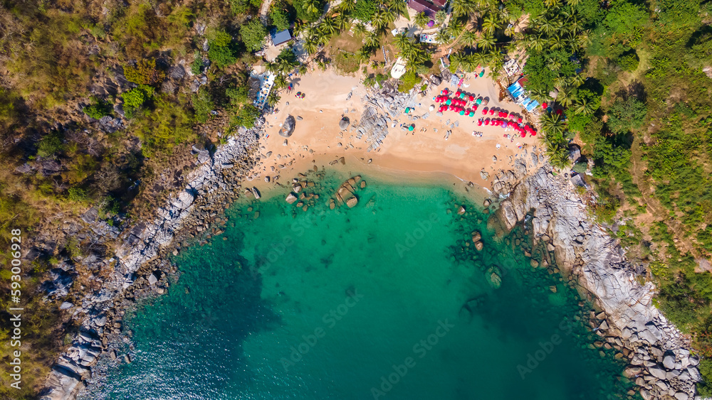 Beautiful beach with colorful water. Top view of the beautiful coastline. Sunny summer day. Colorful water. Sandy beach.