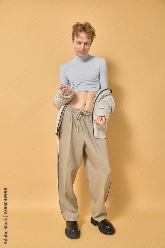 Modern man vogue hip-hop dancer in motion wearing stylish clothing beige pants crop top and coat showing dance movements standing with bare belly smiling fooling around over yellow background.