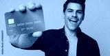 Impressed handsome young person holds in hand debit credit card happy open mouth isolated on yellow color background. Close up of big bank card in hand of 20s young man hipster in blue shirt