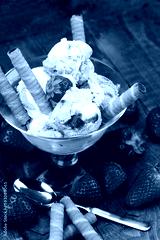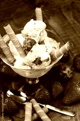Coppa di gelato al mandecato di fragola con fragole e cannoli di wafer al cioccolato