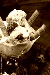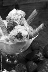 Coppa digelato al mandecato alla fragola con fragole e cannoli di wafer al cioccolato