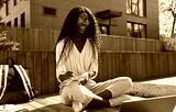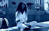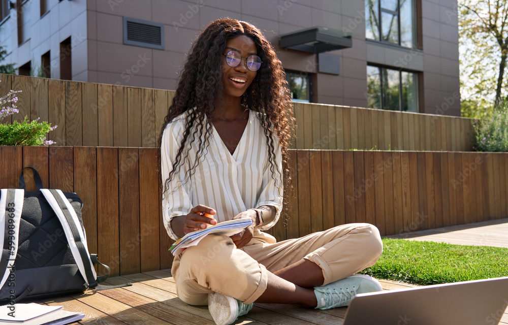 Happy black young woman model, pretty curly African female university student elearning using laptop computer studying outside campus on sunny day, remote learning online, having hybrid call.