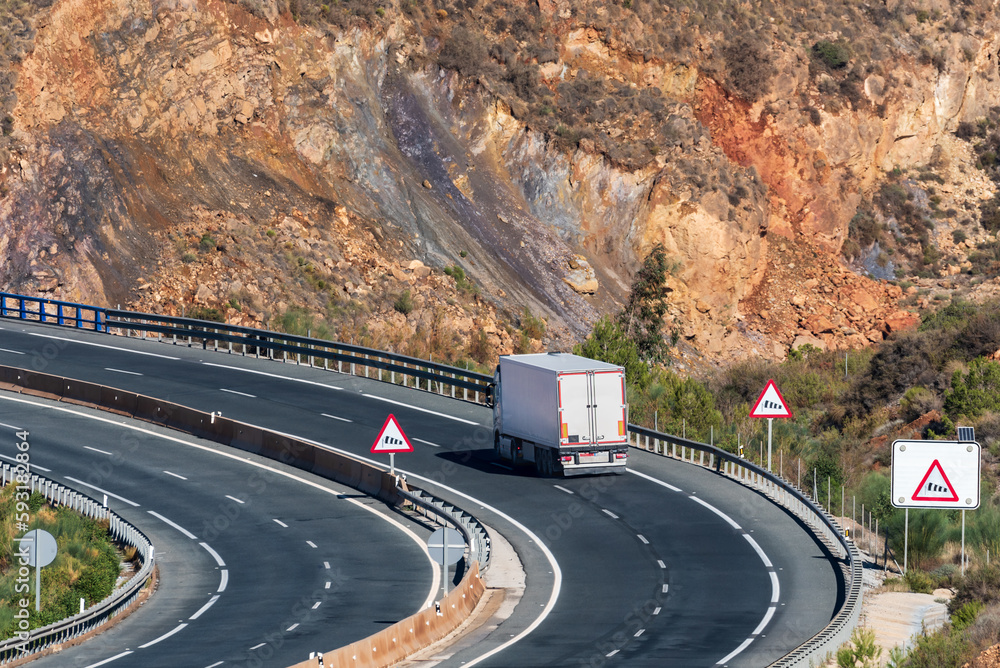 Truck with a refrigerated semi-trailer driving on a road with warning signs for strong winds, rear view.