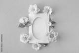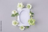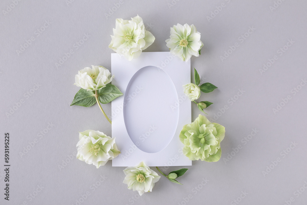 Blank paper sheet card or trendy mockup decorated with natural flowers top view and flat lay. Minimal aesthetic invitation template.