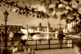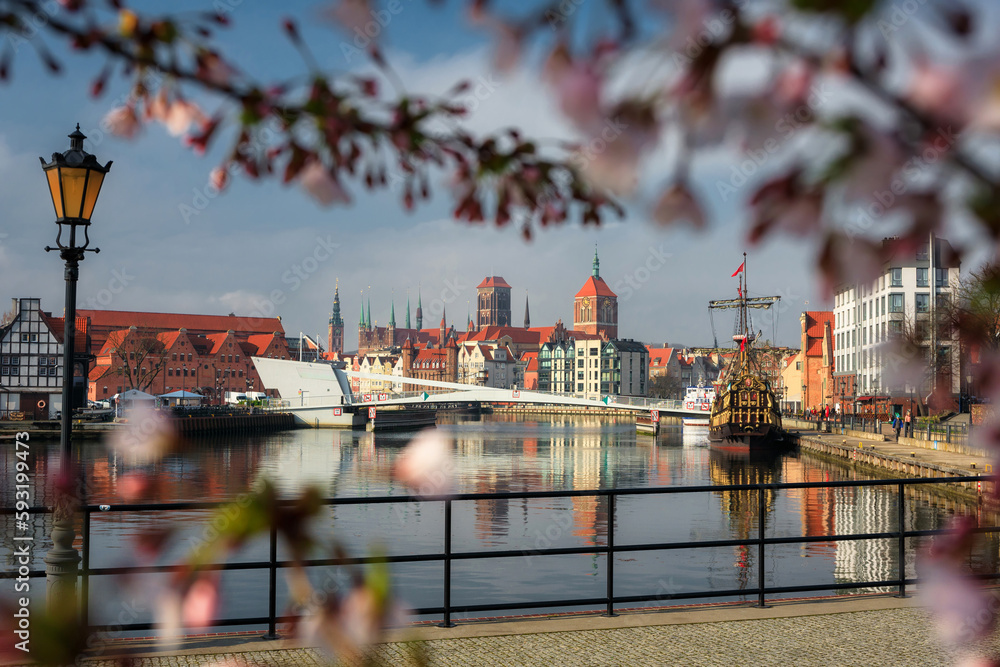 Flowers of trees blooming in spring over the Motława river in Gdansk. Poland