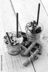 Gelato al cioccolato con cioccolato e cannoli di wafer al cioccolato