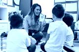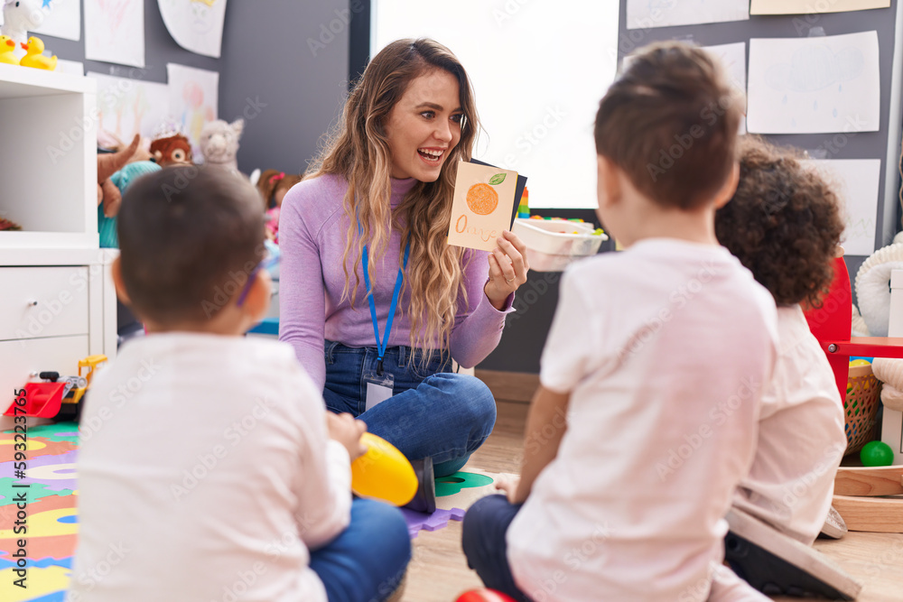 Woman and group of kids having vocabulary lesson with word cards at kindergarten