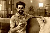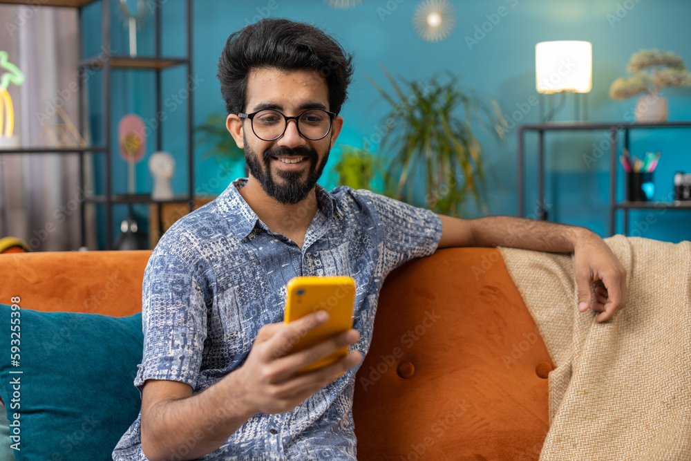 Indian man sitting on sofa uses mobile phone smiles at home living room apartment. Hindu young guy texting share messages content on smartphone social media applications online, watching relax movie