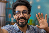 POV of indian man blogger taking selfie on smartphone, communicating video call online with social media subscribers followers, recording vlog stories. Young hindu guy at home apartment room on couch