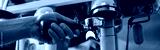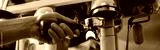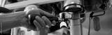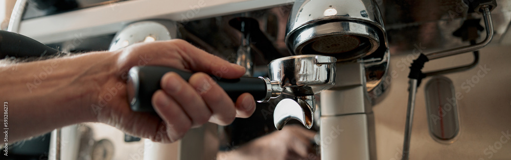 Close-up of male hand holding portfilter near coffee grinder, picking up ground coffee