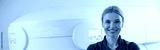Doctor radiologist on background of MRI or CT Scan with patient. High-Tech medical equipment