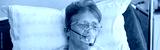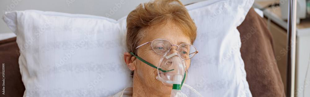 Senior patient in breathing mask lies in the ward during treatment for Covid-19. High quality photo