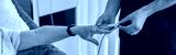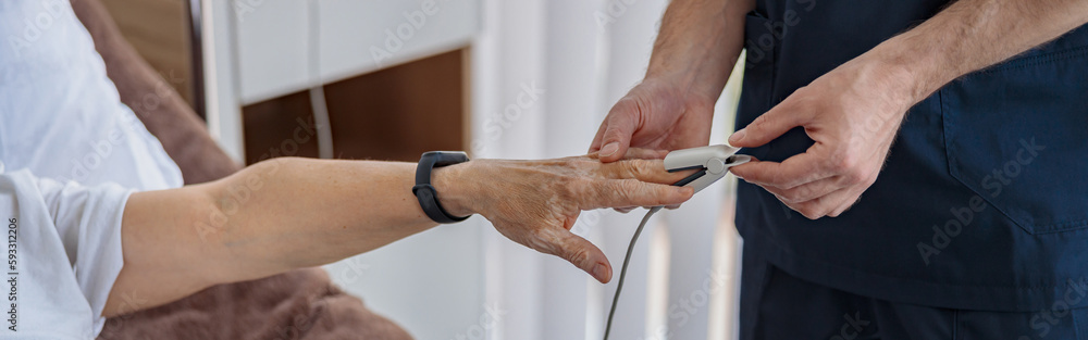 Nurse checking with fingertip pulse oximeter oxygen saturation of patient blood. High quality photo