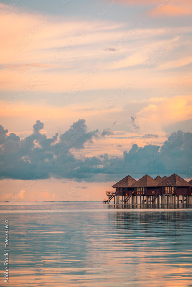 Amazing sunset panorama at Maldives. Luxury resort hotel villas seascape, calm sea water surface under colorful sky. Ocean lagoon, stunning romantic skyscape, seascape. Relax inspire vacation beach
