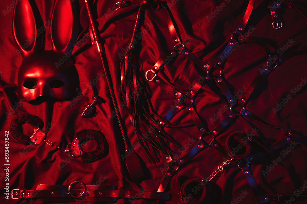 Set of erotic sex toys for adults. Handcuffs, leather whip flogger, mask, choker and butt plug for sex with domination and submission