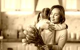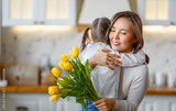 Daughter giving mother bouquet of flowers.