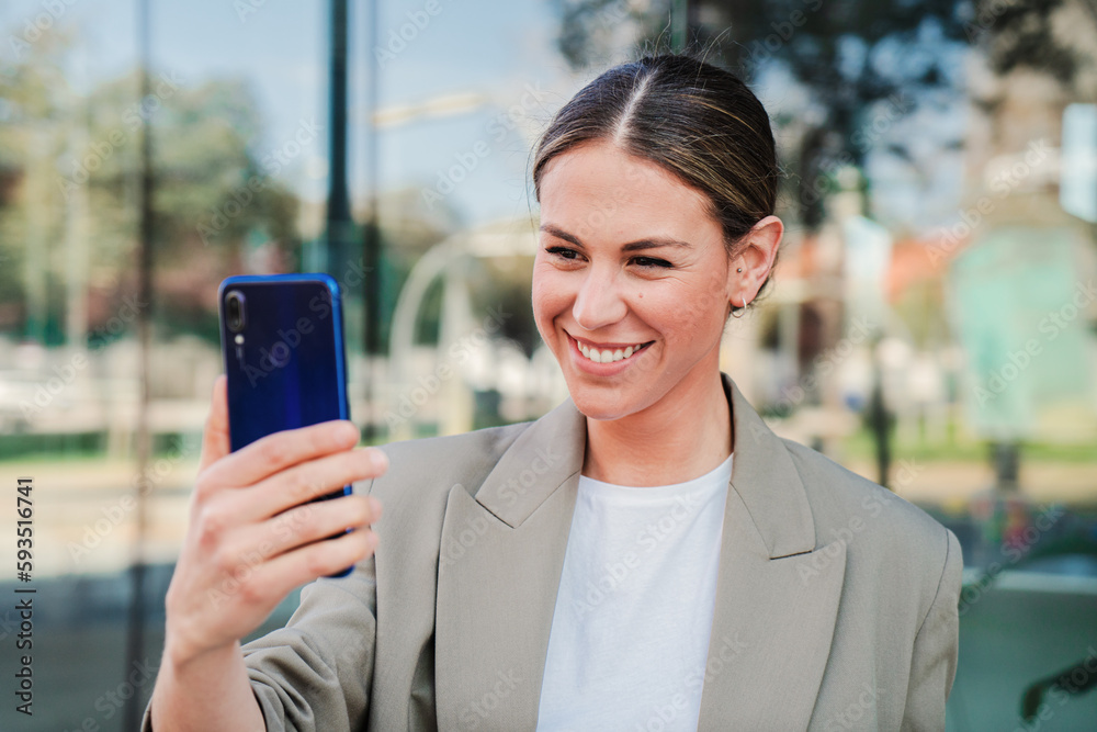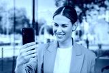 Young successful business woman with suit watching on the cellphone her shares of stock and investments. Happy corporate executive female browsing on internet using a smart phone device on a workspace