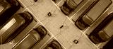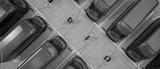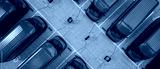 Overhead shot of electric EV delivery vans are being charged in company parking garage