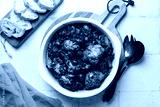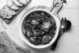 Italian rabbit stew cooked with white wine, tomatoes and olives, thyme and rosemary. Coniglio all'ischitana. Ischia dish. Bread. op view.