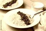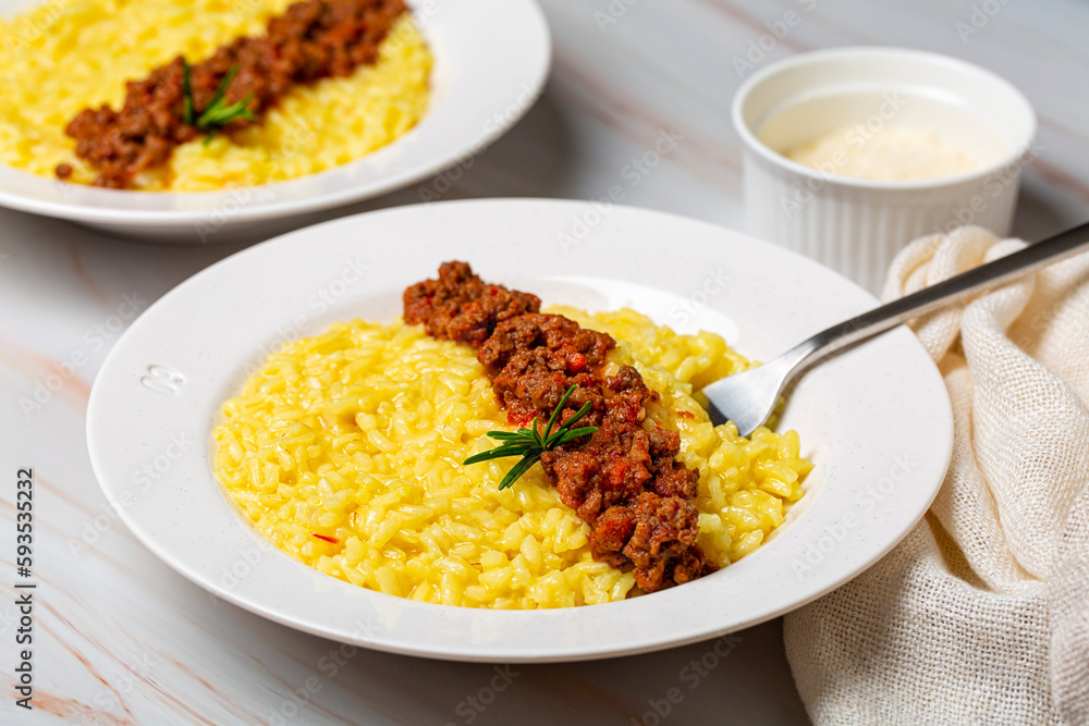 Close-up of risotto alla milanese or risotto allo zafferano with meat ragu sauce. Italian dish made from saffron, rice, butter, hard cheese and vegetable broth. White table. Top view.