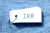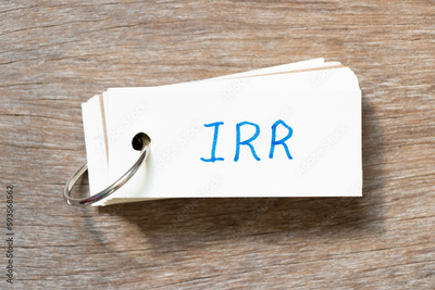 Flash card with handwriting in word IRR (Abbreviation of internal rate of return) on wood background