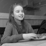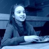 A teenage girl eats pizza. Portrait of a smiling girl at dinner in a red sweater. square format