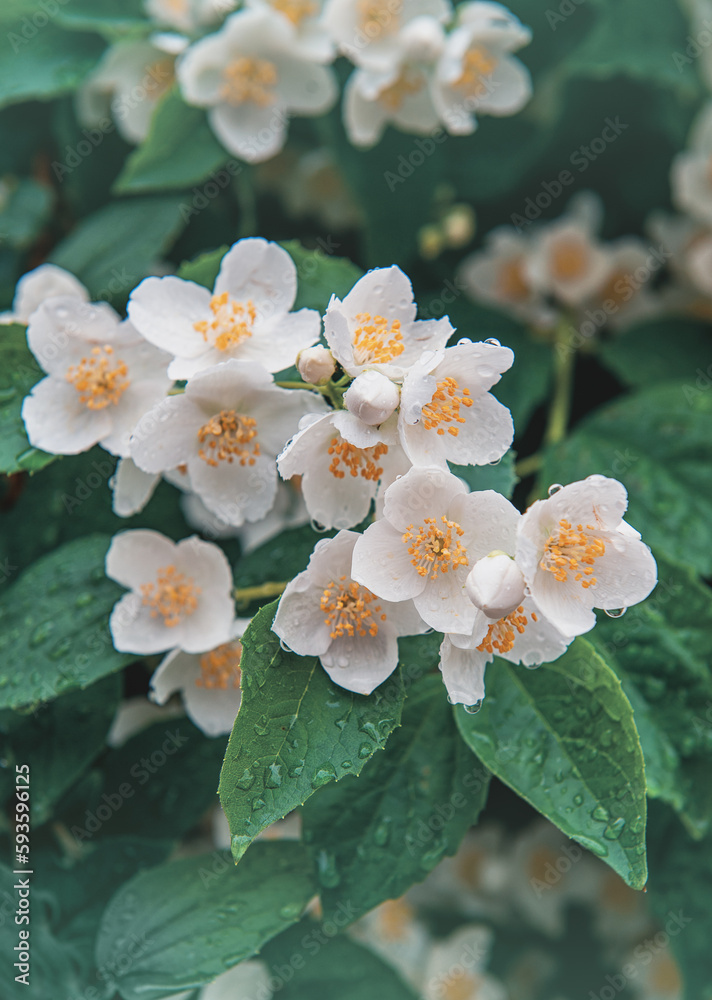 Beautiful white flowers on green leaves background
