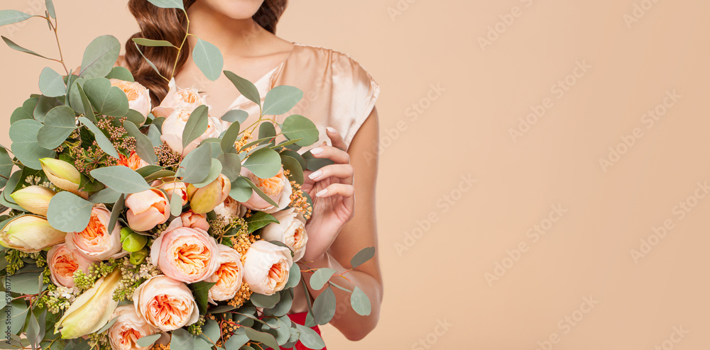 A photo of an unrecognisable woman, receiving or presenting flowers with a beige background. The bouquet of pink peonies and the female elegance deliver spring tenderness in the picture.