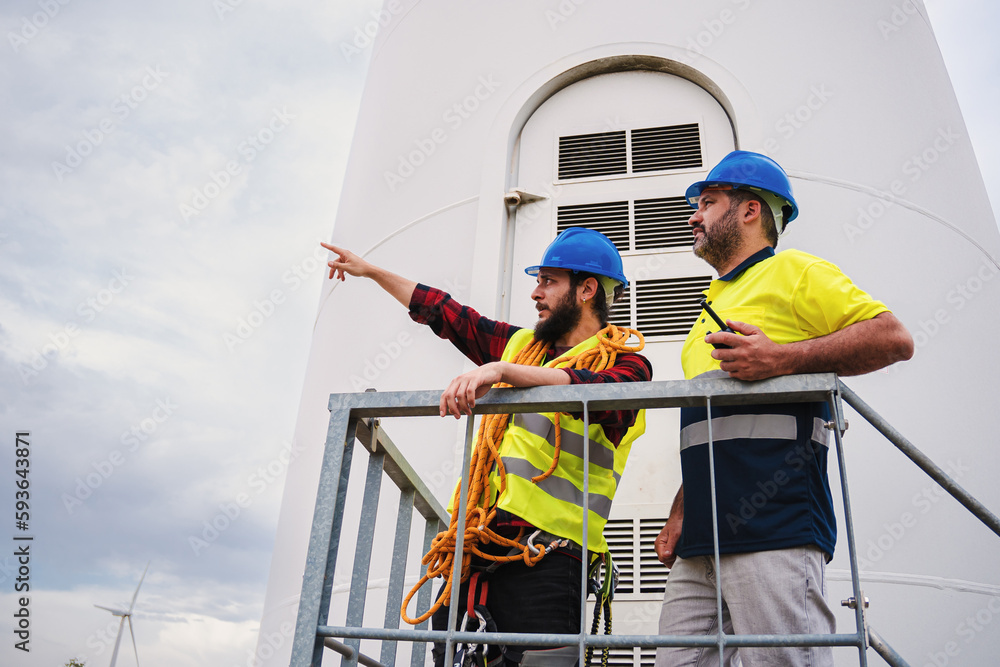 Two windmill engineer pointing to the turbine they have to do maintenance on. Renewable energy technicians expert taling, working together and doing an inspection of the generator checking the power