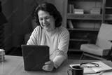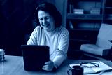 Happy middle aged senior woman holding tablet talk on video call with friends family. Laughing mature old senior grandmother having fun talking speaking with grown up children online