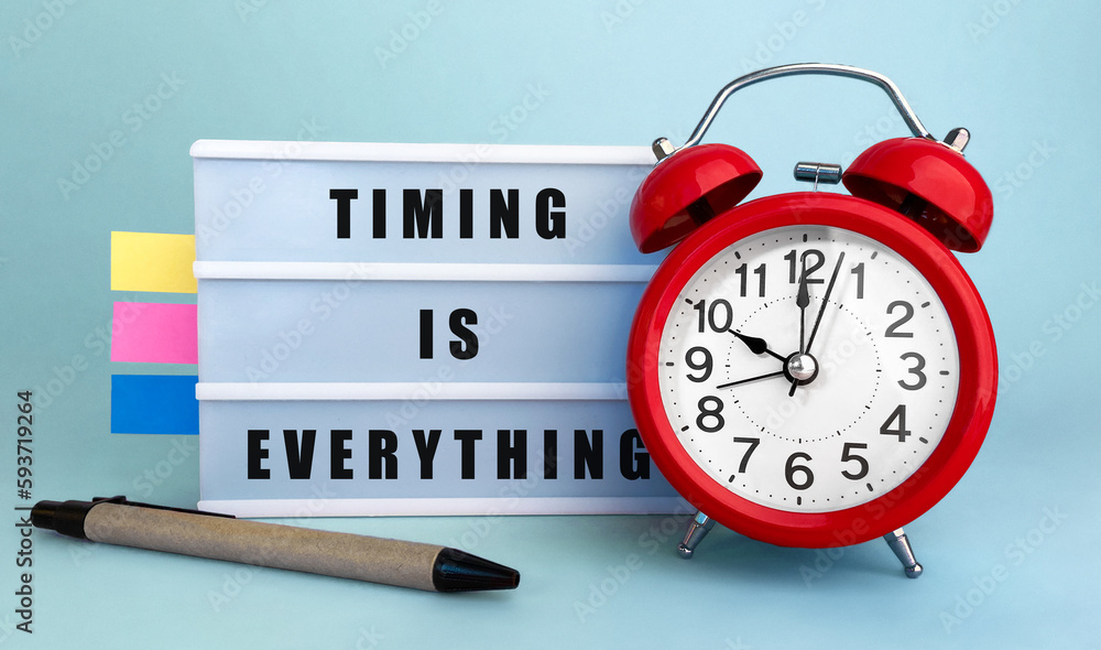 Text Timing is everything written on the lightbox with alarm clock and colorfull stickers on blue background
