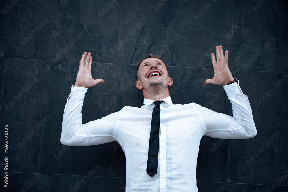 Portrait of a happy, attractive, excited, joyful man with a wide open mouth and raised hands, looking at the camera, having successfully passed their exams, completed works