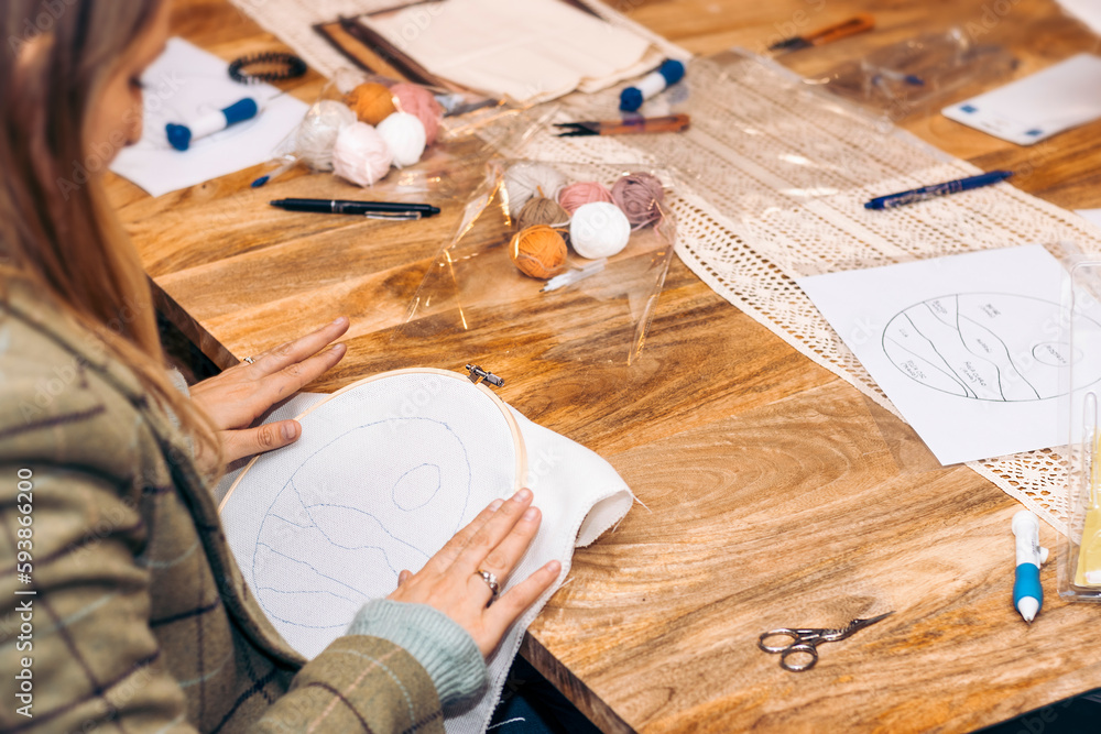Punch Needle Workshop. Young woman tightening her weaving frame.
