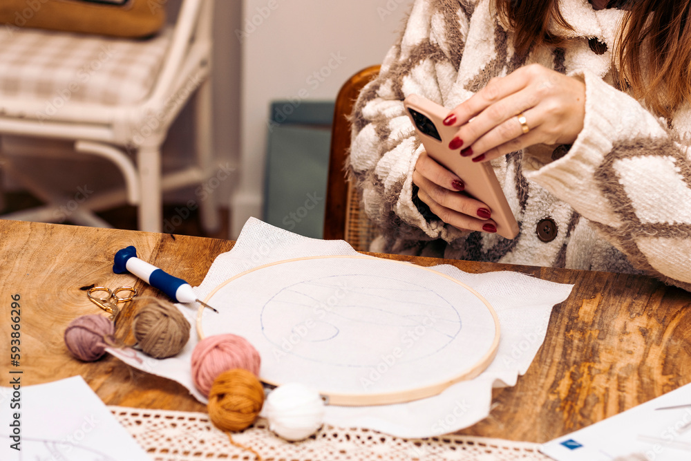 Punch Needle Workshop. Young woman taking a picture with her phone