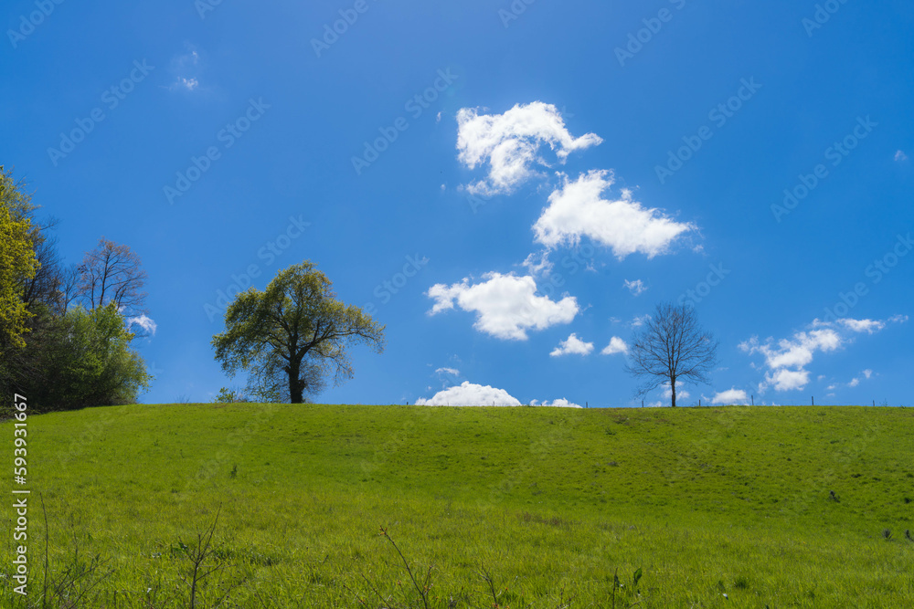 Green field with a beautiful grass and a blue sky with charming clouds in the french countryside