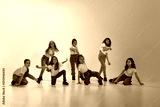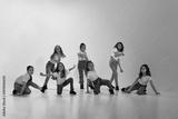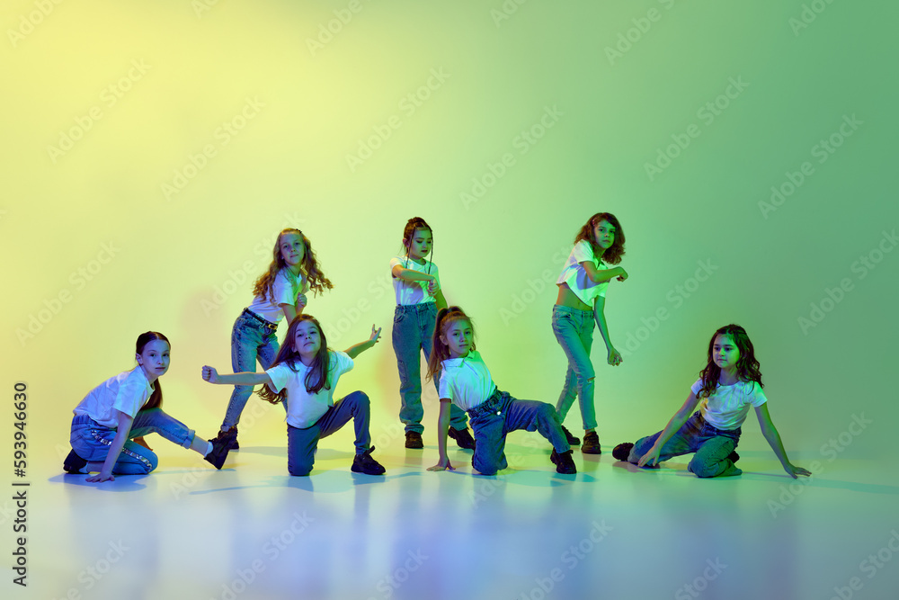 Group of little girls, children in casual clothes dancing, learning modern dance styles against green studio background in neon light. Childhood, hobby, sportive lifestyle, action and motion concept