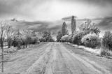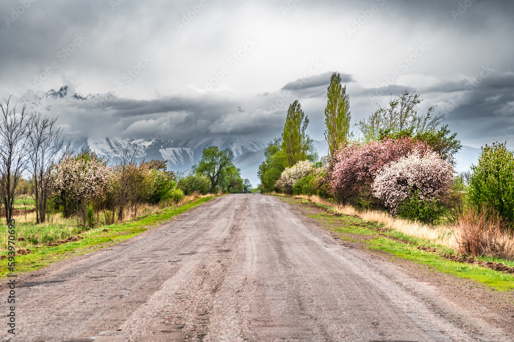 Road with trees blooming with pink flowers in spring. Cloudy sky over mountains.